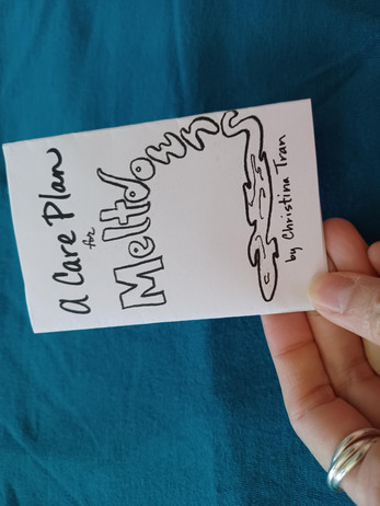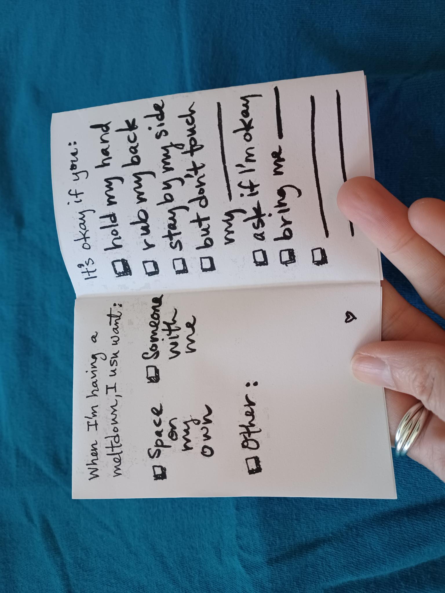 A little mini zine to help folks reflect on what their (autistic or other) meltdowns are like -- and to help them have conversation with loved ones or care pods in their lives about what they need during those times. Made from personal experience and with imperfect love.